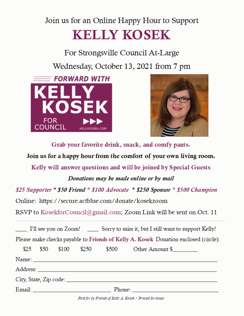 Join us for an Online Happy Hour to Support COUNCILWOMAN KELLY KOSEK For Strongsville Council At-Large on Wednesday, October 13, 2021 at 7 pm.