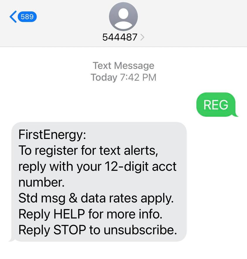 To submit an outage report via text, you need to register first. Just text REG to 544487. You’ll need your First Energy account number to complete the registration. Once you’re registered just text “OUT” to report your problem. Simple!